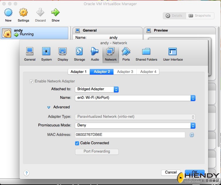 安裝以後, 要在virtualbox 的Andy image上,選Settings , Network, 把network adapter 2 的attached to 設定成bridged adapter。