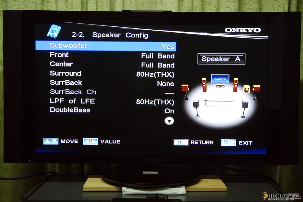 在未試機前,先介紹一吓Rocky嘅玩機空間。約9呎乘12呎直廳,觀賞距離約為9呎,隻JL F113就放响皇帝位右邊前約4呎,比例非常合適。又攞嚟試機天碟Spiderman 3,試咗幾段,Pepsiman與筆者都發覺背景音樂唔夠出,使到睇戲時嘅氣氛大大減低,而且高頻有少少叫,同埋高低頻有銜接唔倒嘅情況。 Pepsiman立刻開啟Onkyo 906嗰menu睇睇…,發覺前置及中置都Set為Full Band,環繞Set 為80Hz,LFE 80HZ,以及Double Bass: On。Pepsiman先將前、中、後置分頻點劃一改為80Hz,再將超低音的音壓加大1.5個db,JL 113嘅擺位都將佢擺後一啲,再調校一下喇叭嘅距離及音量大小。校完之後大家坐低再聽一次,聲音順耳番,無咁「拮」耳,背景音樂亦加强咗動態。