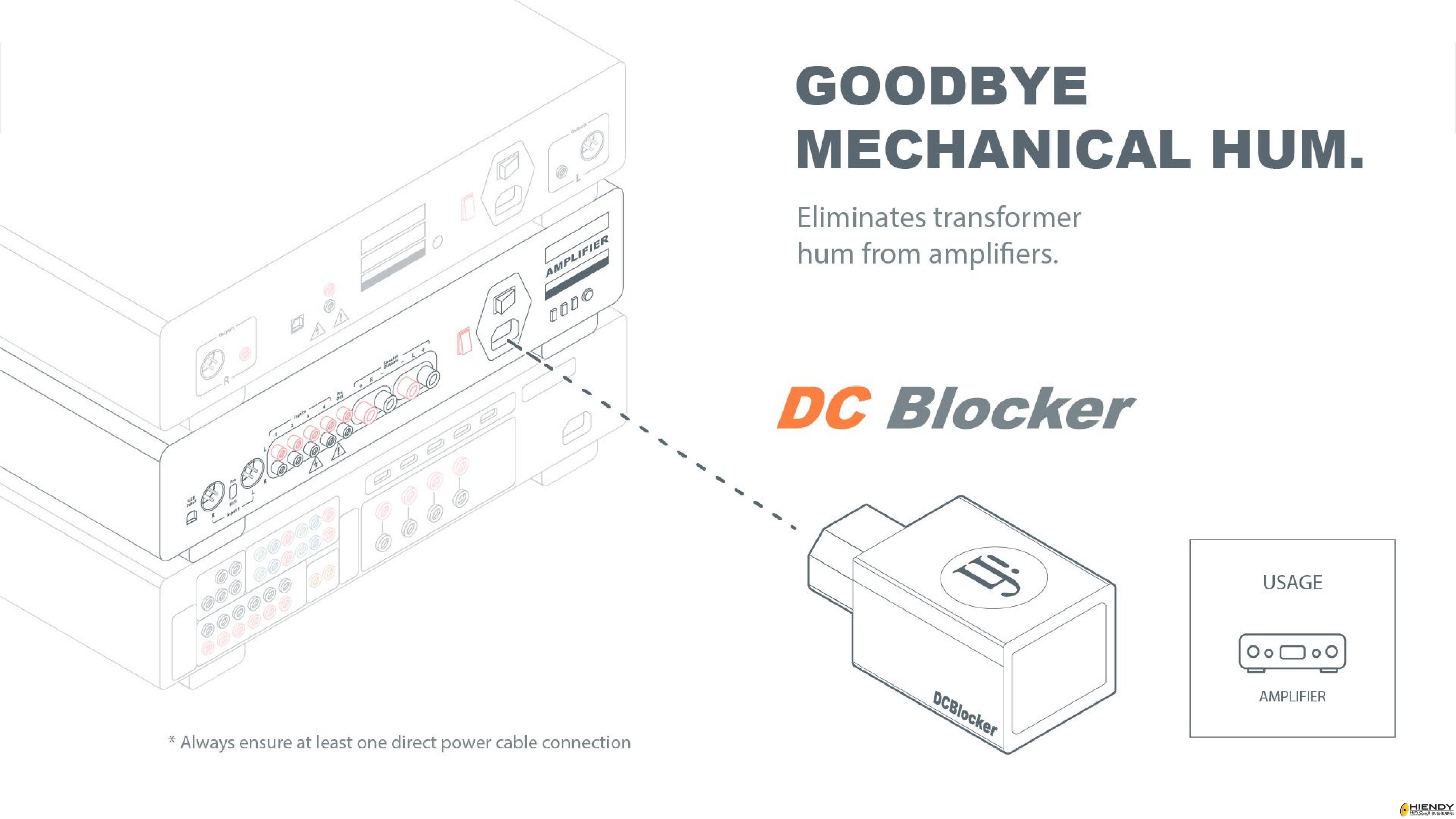 The DC Blocker is a clever device that you place at the IEC (at the rear power inlet) and as its name implies, it stops DC from getting into the amplifier. It therefore eliminates amplifier transformer hum.