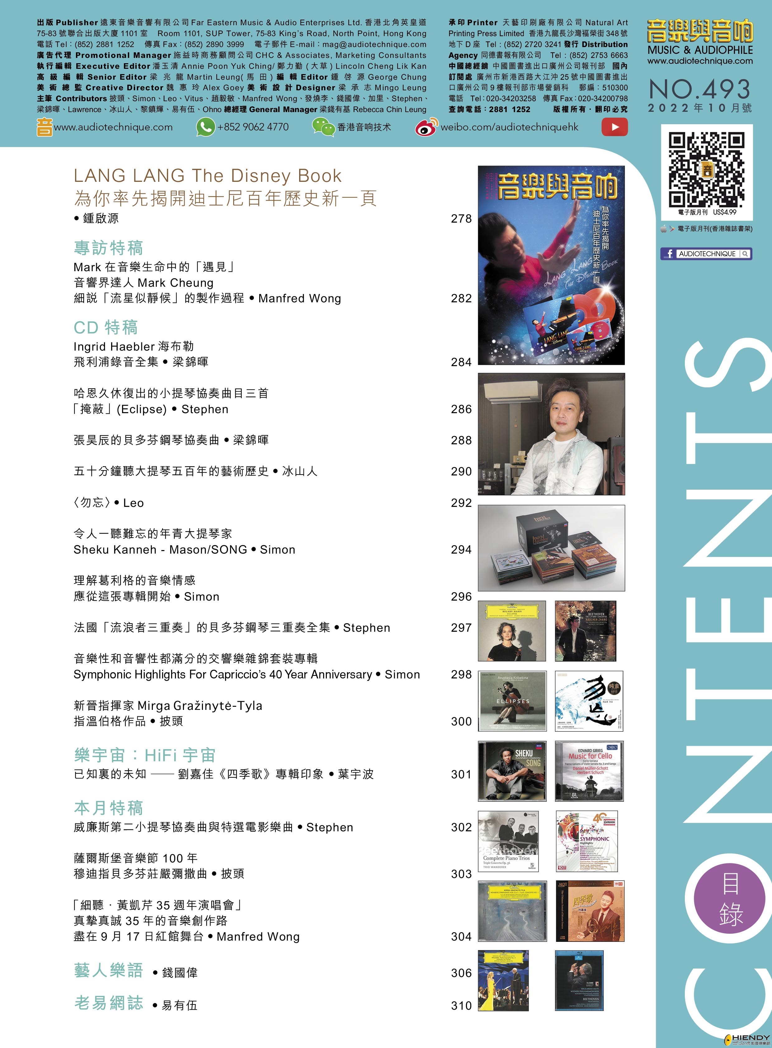 今期的音樂與音响封面專題 : LANG LANG The Disney Book 為你率先揭開迪士尼百年歷史新一頁。專訪特稿 : 音響界達人Mark Cheung 細說「流星似靜候」的製作過程 。CD特稿 : Ingrid Haebler海布勒飛利浦錄音全集、哈恩久休復出的小提琴協奏曲目三首「掩蔽」(Eclipse)、張昊辰的貝多芬鋼琴協奏曲、五十分鐘聽大提琴五百年的藝術歷史、〈勿忘〉、令人一聽難忘的年青大提琴家Sheku Kanneh – Mason/SONG 、理解葛利格的音樂情感 應從這張專輯開始、法國「流浪者三重奏」的貝多芬鋼琴三重奏全集、音樂性和音響性都滿分的交響樂雜錦套裝專輯Symphonic Highlights For Capriccio’s 40 Year Anniversary、新晉指揮家Mirga Gražinytė-Tyla 指溫伯格作品。本月特稿 : 威廉斯第二小提琴協奏曲與特選電影樂曲、薩爾斯堡音樂節100年 穆迪指貝多芬莊嚴彌撒曲、「細聽.黃凱芹35週年演唱會」真摯真誠35年的音樂創作路盡在9月17日紅館舞台。其餘的HiFi宇宙、藝人樂語、老易網誌 …等等欄目也是同樣內容豐富,記緊捧場啊!