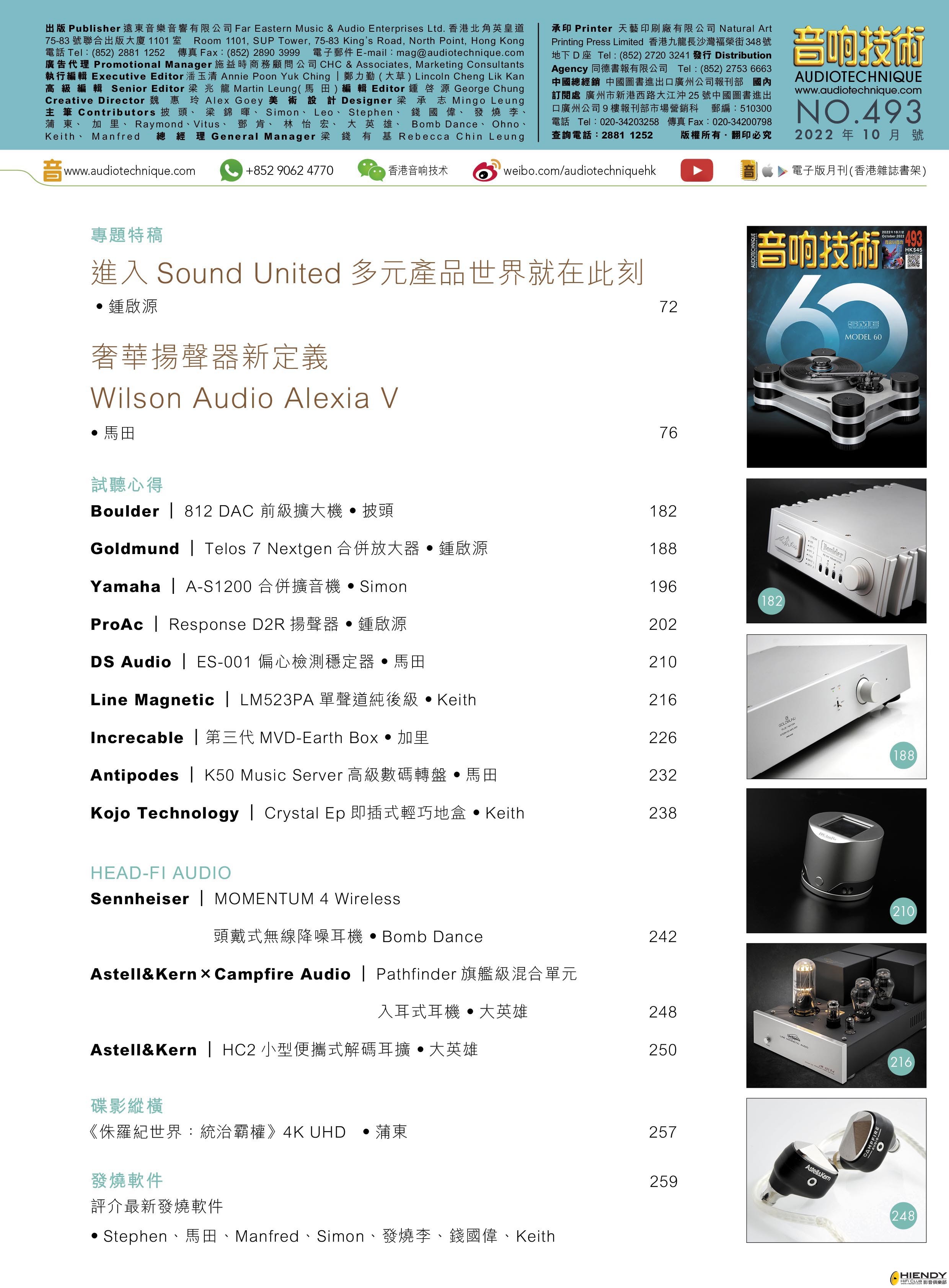 | 今期封面專題由大草、馬田、鍾啟源 評論SME Model 60新旗艦唱盤。專題特稿:開心放心 滿載而歸「2022香港高級視聽展」(下)、進入Sound United多元產品世界就在此刻 、奢華揚聲器新定義Wilson Audio Alexia V 。其他評論文章包括:Boulder 812 DAC 前級擴大機、Goldmund Telos 7 Nextgen合併放大器、Yamaha A-S1200 合併擴音機、ProAc Response D2R揚聲器、DS Audio ES-001 偏心檢測穩定器、Line Magnetic LM523PA單聲道純後級、Increcable 第三代MVD-Earth Box、Antipodes K50 Music Server高級數碼轉盤、Kojo Technology Crystal Ep即插式輕巧地盒、Sennheiser MOMENTUM 4 Wireless 頭戴式無線降噪耳機、Astell&Kern×Campfire Audio Pathfinder旗艦級混合單元入耳式耳機、Astell&Kern HC2小型便攜式解碼耳擴,詳細內容請參閱目錄。
