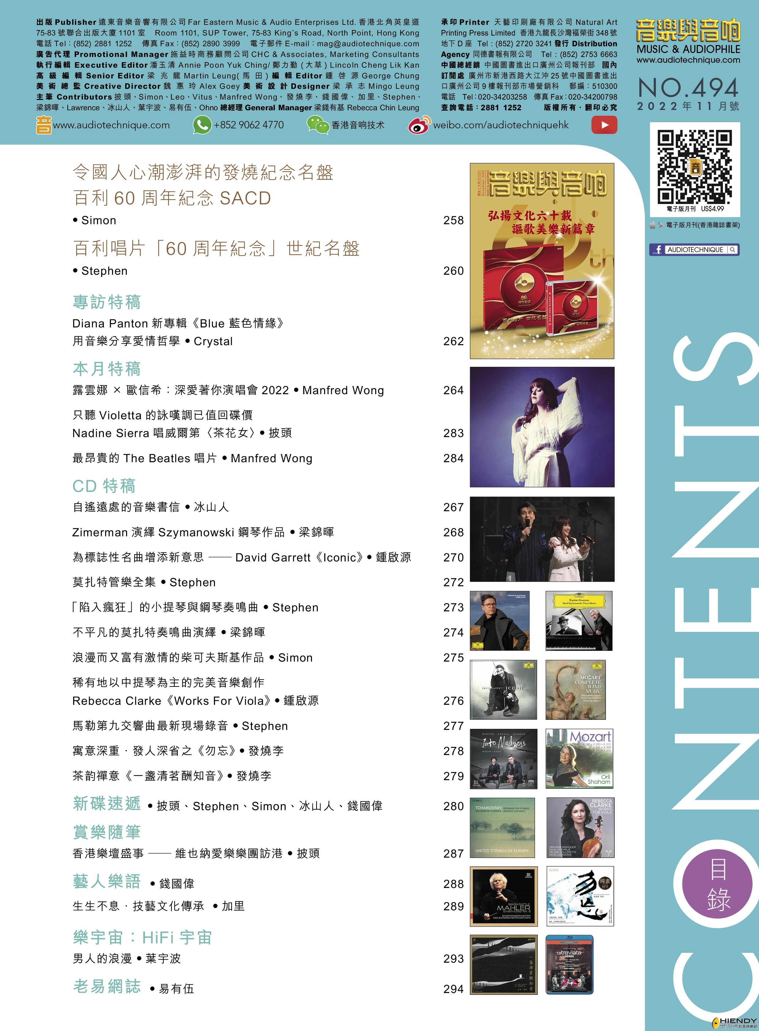 今期的音樂與音响封面專題 : 百利唱片「60周年紀念」世紀名盤。專訪特稿 : Diana Panton新專輯《Blue 藍色情緣》用音樂分享愛情哲學 。本月特稿 : 露雲娜×歐信希:深愛著你演唱會 2022 、最昂貴的The Beatles唱片。 CD特稿 : Zimerman演繹Szymanowski鋼琴作品、David Garrett《Iconic》、自遙遠處的音樂書信、莫扎特管樂全集、「陷入瘋狂」的小提琴與鋼琴奏鳴曲、不平凡的莫扎特奏鳴曲演繹 、浪漫而又富有激情的柴可夫斯基作品 、Rebecca Clarke《Works For Viola》 、馬勒第九交響曲最新現場錄音 、寓意深重.發人深省之《勿忘》、茶韵禪意《一盞清茗酬知音》。賞樂隨筆 : 香港樂壇盛事 —— 維也納愛樂樂團訪港。其餘的新碟速遞、HiFi宇宙、藝人樂語、老易網誌 …等等欄目也是同樣內容豐富,記緊捧場啊!