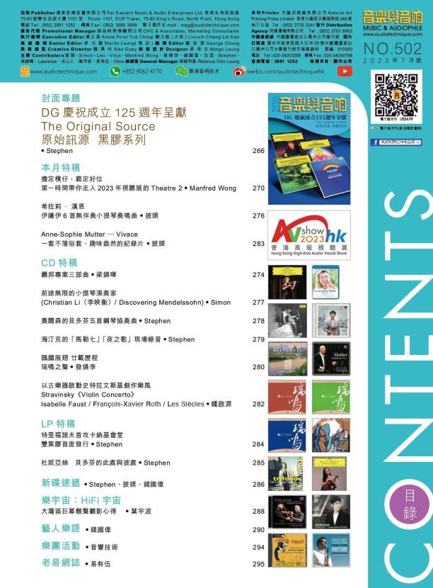 今期的音樂與音响封面專題 : DG慶祝成立125週年呈獻The Original Source 原始訊源 黑膠系列。本月特稿 : 第一時間帶你走入2023年視聽展的Theatre 2、希拉莉 ·漢恩 伊薩伊6首無伴奏小提琴奏鳴曲、Anne-Sophie Mutter — Vivace一套不落俗套,趣味盎然的紀錄片。CD特稿 : 蕭邦專案三部曲 、Christian Li〈李映衡〉/ Discovering Mendelssohn、奧爾森的貝多芬五首鋼琴協奏曲、海汀克的「馬勒七」「夜之歌」現場錄音、鵾鵬展翅 廿載歷程 瑞鳴之聲、以古樂器啟動史特拉文斯基創作樂風。LP特稿 : 特里福諾夫首攻卡納基會堂雙黑膠首度發行、杜妮亞絲 貝多芬的此處與彼處。其餘的新碟速遞、HiFi宇宙、藝人樂語、老易網誌 …等等欄目也是同樣內容豐富,記緊捧場啊!