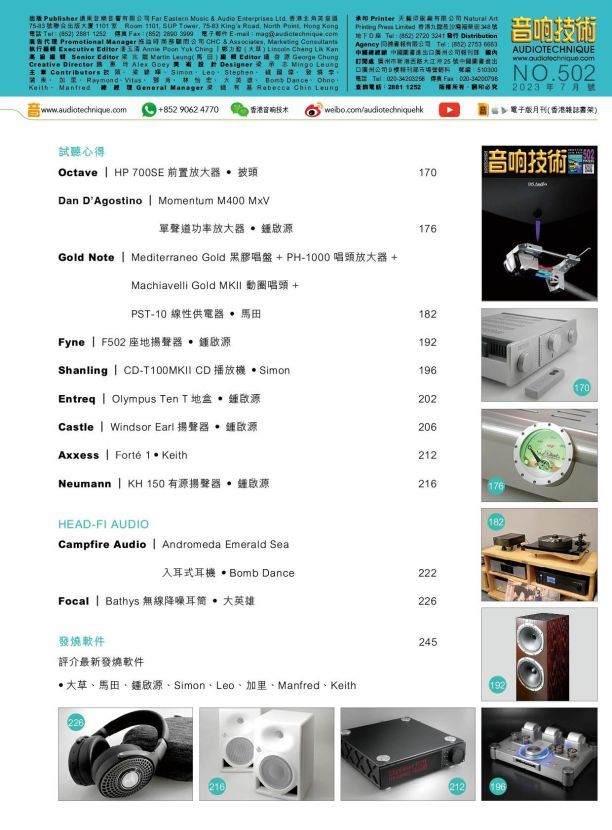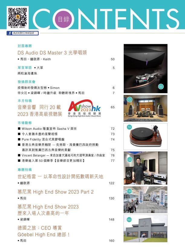 今期封面專題由馬田、鍾啟源、Keith評論DS Audio DS Master 3 光學唱頭。專題特稿:慕尼黑 High End Show 2023 Part 2、德國之旅:CEO 導賞Göebel High End 總部 、世紀格雷 一 以革命性設計開拓數碼新天地。其他評論文章包括:Octave HP 700SE前置放大器、Dan D’Agostino Momentum M400 MxV單聲道功率放大器、Gold Note Mediterraneo Gold 黑膠唱盤 + PH-1000 唱頭放大器 + Machiavelli Gold MKII 動圈唱頭 + PST-10 線性供電器、Fyne F502座地揚聲器 、Shanling CD-T100MKII CD播放機、Entreq Olympus Ten T地盒、CastleWindsor Earl揚聲器、Axxess Forté 1、Neumann KH 150有源揚聲器、Campfire Audio Andromeda Emerald Sea入耳式耳機、Focal Bathys無線降噪耳筒。詳細內容請參閱目錄。