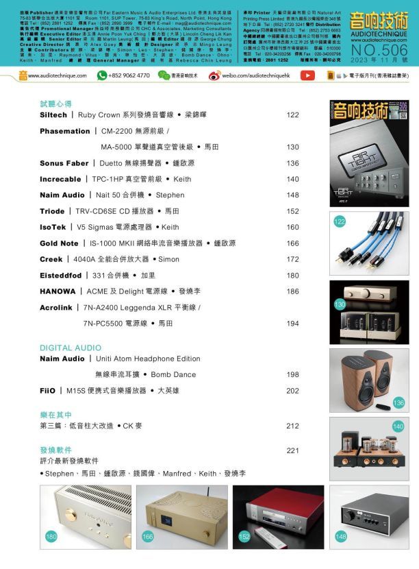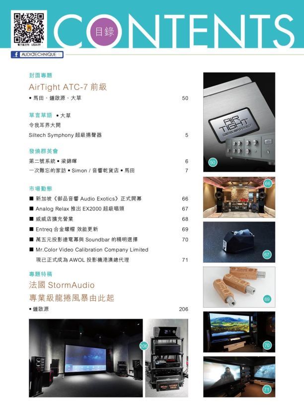 今期封面專題由馬田、鍾啟源、大草評論AirTight ATC-7前級。專題特稿 : 法國StormAudio專業級龍捲風暴由此起。其他評論文章包括:Siltech Ruby Crown系列發燒音響線、Phasemation CM-2200 無源前級 / MA-5000 單聲道真空管後級 、Sonus Faber Duetto 無線揚聲器、Increcable TPC-1HP真空管前級、Naim Audio Nait 50合併機、Triode TRV-CD6SE CD播放器、IsoTek V5 Sigmas電源處理器、Gold Note IS-1000 MKII網絡串流音樂播放器 、Creek 4040A全能合併放大器、Eisteddfod 331合併機 、HANOWA ACME及Delight電源線、Acrolink 7N-A2400 Leggenda XLR 平衡線 / 7N-PC5500 電源線、Naim Audio Uniti Atom Headphone Edition無線串流耳擴、FiiO M15S便携式音樂播放器。詳細內容請參閱目錄。