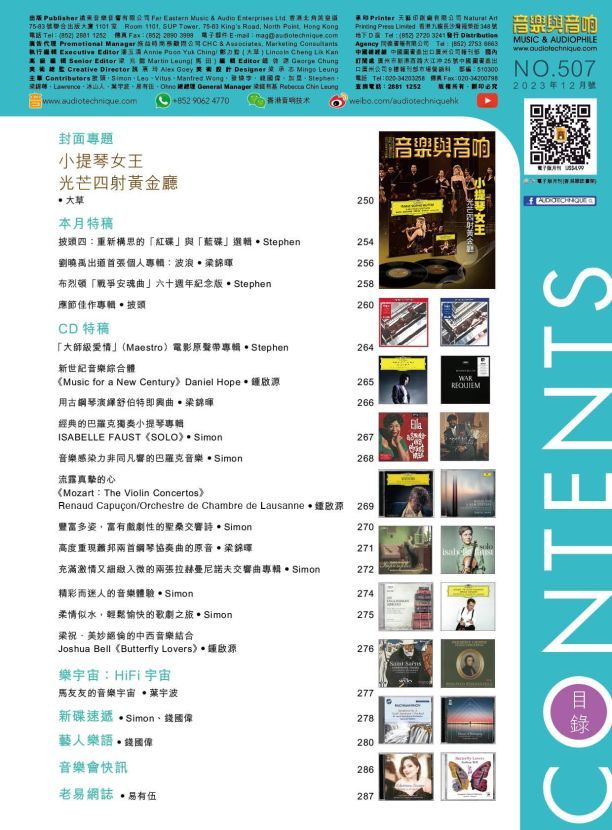 今期的音樂與音响封面專題 : 小提琴女王光芒四射黃金廳。本月特稿 : 披頭四:重新構思的「紅碟」與「藍碟」選輯 、劉曉禹出道首張個人專輯:波浪、布烈頓「戰爭安魂曲」六十週年紀念版、應節佳作專輯。CD特稿 :「大師級愛情」(Maestro)電影原聲帶專輯、《Music for a New Century》Daniel Hope、用古鋼琴演繹舒伯特即興曲 、ISABELLE FAUST《SOLO》、音樂感染力非同凡響的巴羅克音樂 、《Mozart:The Violin Concertos》Renaud Capuçon、豐富多姿,富有戲劇性的聖桑交響詩 、高度重現蕭邦兩首鋼琴協奏曲的原音、充滿激情又細緻入微的兩張拉赫曼尼諾夫交響曲專輯、精彩而迷人的音樂體驗、柔情似水,輕鬆愉快的歌劇之旅、Joshua Bell《Butterfly Lovers》。其餘的新碟速遞、HiFi宇宙、藝人樂語、音樂會快訊、老易網誌 …等等欄目也是同樣內容豐富,記緊捧場啊!