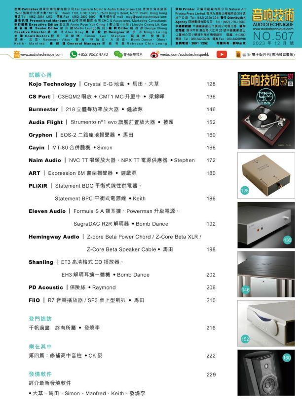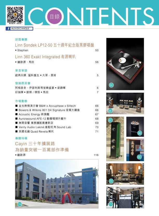 今期封面專題由Stephen評論Linn Sondek LP12-50五十週年紀念版黑膠唱盤、鍾啟源、馬田評論Linn 360 Exakt Integrated有源喇叭。專題特稿 : Cayin三十年擴展路為銷量突破一百萬部作準備。其他評論文章包括:Kojo Technology Crystal E-G地盒、CS Port C3EQM2唱放 + CMT1 MC升壓牛 、Burmester 218立體聲功率放大器、Audia Flight Strumento n°1 evo旗艦前置放大器、Gryphon EOS-2 二路座地揚聲器、Cayin MT-80合併膽機、Naim Audio NVC TT唱頭放大器 / NPX TT電源供應器、ART Expression 6M書架揚聲器 、PLiXiR Statement BDC平衡式線性供電器 / Statement BPC 平衡式電源線、Eleven Audio Formula S A類耳擴 / Powerman升級電源 / SagraDAC R2R解碼器 、Hemingway Audio Z-core Beta Power Chord / Z-Core Beta XLR / Z-Core Beta Speaker Cable、Shanling ET3高清格式CD播放器 / EH3解碼耳擴一體機、PD Acoustic 保險絲、FiiO R7 音樂播放器 / SP3 桌上型喇叭。詳細內容請參閱目錄。
