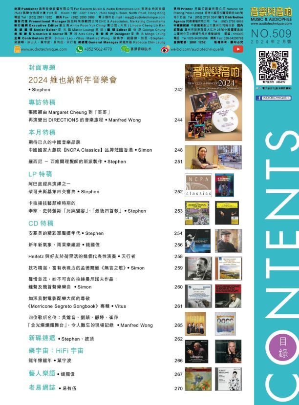 今期的音樂與音响封面專題 : 2024維也納新年音樂會。專訪特稿: 張國穎由Margaret Cheung到「哥哥」再演變出DIRECTIONS的音樂旅程。本月特稿 期待已久的中國音樂品牌中國國家大劇院【NCPA Classics】品牌蒞臨香港、羅西尼 - 西維爾理髮師的新派製作。LP特稿 : 阿巴度經典演繹之一 柴可夫斯基第四交響曲 、卡拉揚技藝顛峰時期的李察.史特勞斯「死與變容」、「最後四首歌」。 CD特稿 : 安塞美的精彩單聲道年代 、新年新氣象,雨果樂繽紛、Heifetz與好友於荷里活的幾個代表性演奏、技巧精湛,富有表現力的孟德爾遜《無言之歌》、聲情並茂,妙不可言的拉赫曼尼諾夫作品:鐘聲及幾首聲樂樂曲 、《Morricone Segreto Songbook》專輯、四位歌后名伶:吳鶯音.劉韻.靜婷.崔萍 「金光燦爛耀舞台」,令人難忘的現場記錄。其餘的新碟速遞、HiFi宇宙、藝人樂語、老易網誌 …等等欄目也是同樣內容豐富,記緊捧場啊!