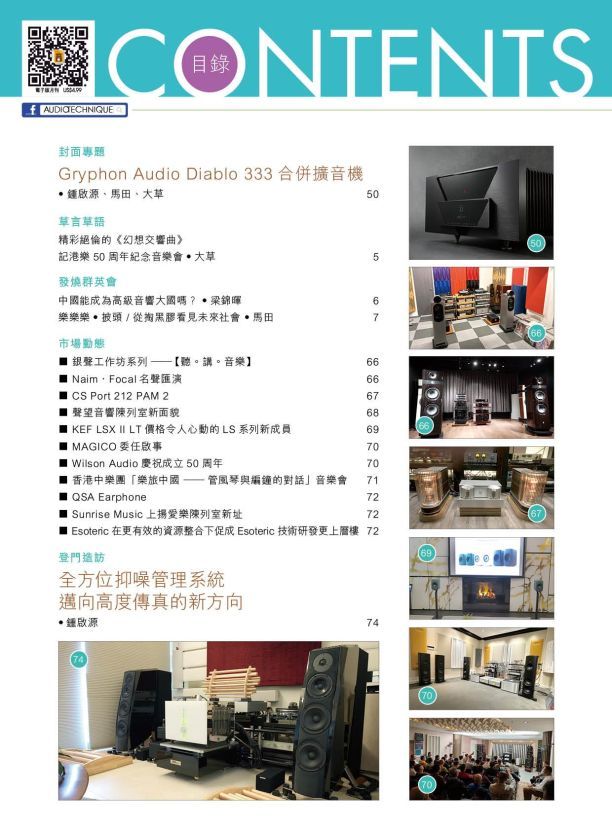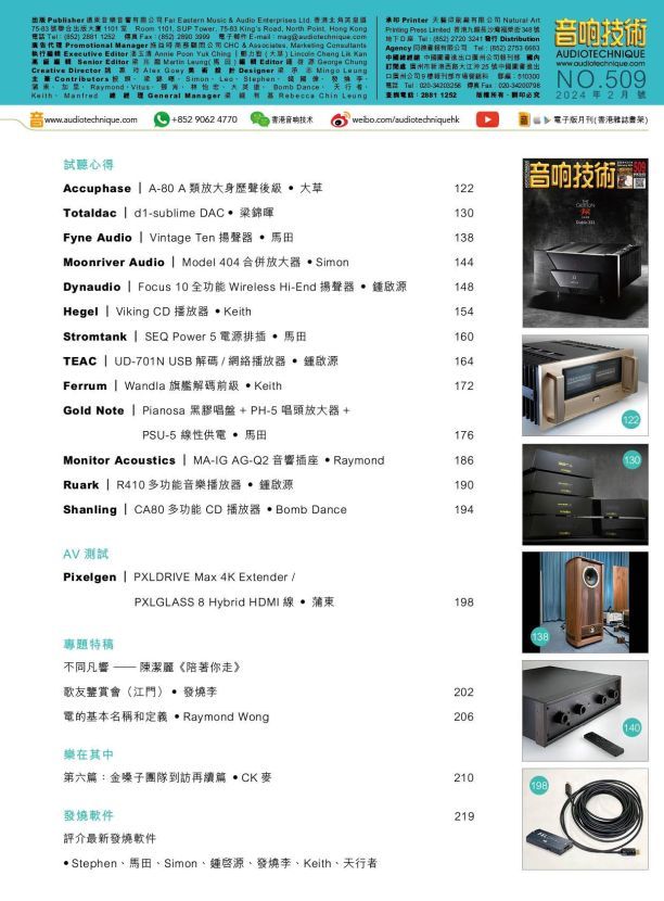 今期封面專題由鍾啟源、馬田、大草評論Gryphon Audio Diablo 333合併擴音機。登門造訪:全方位抑噪管理系統 邁向高度傳真的新方向。其他評論文章包括:Accuphase A-80 A類放大身歷聲後級、Totaldac d1-sublime DAC 、Fyne Audio Vintage Ten揚聲器、Moonriver Audio Model 404合併放大器、Dynaudio Focus 10全功能Wireless Hi-End揚聲器、Hegel Viking CD 播放器 、Stromtank SEQ Power 5電源排插、TEAC UD-701N USB解碼/網絡播放器 、Ferrum Wandla 旗艦解碼前級、Gold Note Pianosa 黑膠唱盤+ PH-5 唱頭放大器+PSU-5 線性供電 、Monitor Acoustics MA-IG AG-Q2音響插座、Ruark R410多功能音樂播放器、Shanling CA80多功能CD 播放器、Pixelgen PXLDRIVE Max 4K Extender / PXLGLASS 8 Hybrid HDMI線。詳細內容請參閱目錄。