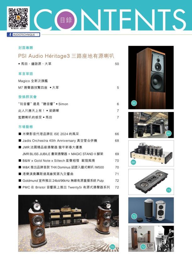 今期封面專題由馬田、鍾啟源、大草評論PSI Audio Héritage3三路座地有源喇叭。其他評論文章包括:ATC SCS70 PRO超低音、CH Precision P10 唱頭放大器 、Luxman D-07X CD/SACD播放器、Gauder Akustik Arcona 80 MkII揚聲器、Burmester 216 立體聲後級、Shanling SCD1.3全能CD/SACD播放器 、Analysis Plus Golden Oval電源線、PMC Prodigy 1揚聲器 、Nordost QRT 系列 – Qnet 網絡交換器 / QSOURCE 線性供電器、Cambridge CXN100網絡播放機 、Lumin D3串流播放器、Onix Miracle 數碼音樂串流播放器、Meze Audio Empyrean II耳機。用家心得: Take One音響層架。專題特稿 :音響器材的電源供應。詳細內容請參閱目錄。