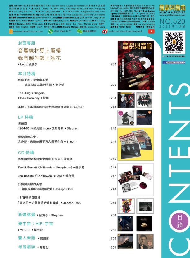 今期的音樂與音响封面專題 : 音響線材更上層樓 錄音製作錦上添花。本月特稿 : 經典重現,探索與革新 —— 撼江湖2之誰與爭鋒、The King’s Singers Close Harmony、美妙及充滿動感的巴赫大提琴組曲全集。LP特稿 : 披頭四 1964-65六款美國mono復刻專輯、樂聖巔峰之作:貝多芬 – 完整的鋼琴和大提琴作品 。CD特稿 : 馬里納與聖馬田室樂團的貝多芬 、David Garrett《Millennium Symphony》、Jon Batiste《Beethoven Blues》、抒情與共融的美學— 讓長笛與豎琴談情說愛、11首輯錄自巴赫「偉大的十八首聖詠合唱前奏曲」。其餘的新碟速遞、HiFi宇宙、藝人樂語、老易網誌 …等等欄目也是同樣內容豐富,記緊捧場啊!