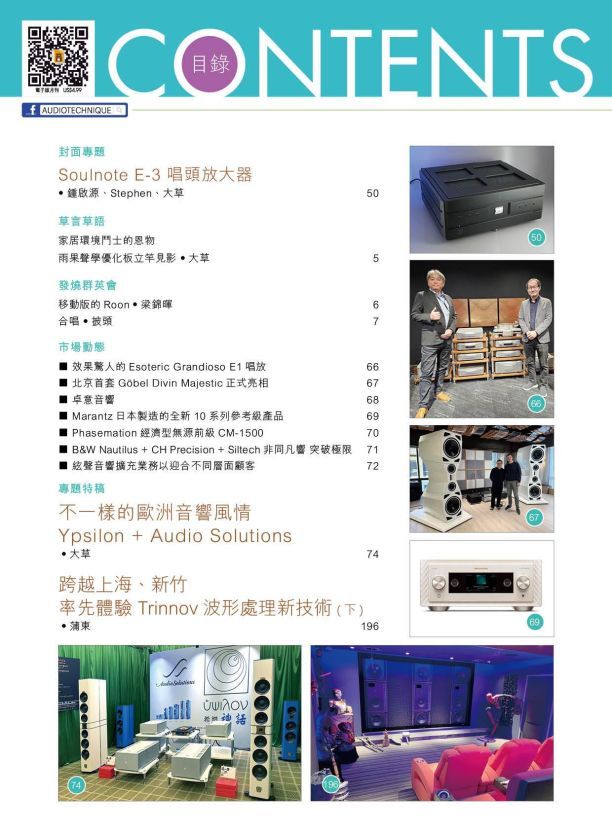 今期封面專題由鍾啟源、Stephen、大草評論Soulnote E-3 唱頭放大器。專題特稿:不一樣的歐洲音響風情Ypsilon + Audio Solutions、跨越上海、新竹率先體驗 Trinnov波形處理新技術。 其他評論文章包括:Luxman DA-07X解碼器與NT-07音樂串流器 、The Wand 14-4 Master黑膠唱盤、Accuphase E-800S 旗艦純 A 類合併式擴音機、Simaudio North Collection 791 網絡串流播放/前級 + 861 立體聲後級 、Estelon YB Mk II 揚聲器、Canor Audio Asterion V2旗艦級真空管唱頭放大器 、Innuos ZENith NG音樂串流伺服器、DS Audio DS-E3入門級光電唱頭/唱放、Analog Sound AS-135真空管合併式功率放大器、Mola Mola Tambaqui DAC /耳擴、OXS Thunder Pro+ Dolby Atmos® 7.1.2 桌面式 Soundbar 配頸枕喇叭、Noble Audio FoKus Apollo混合單元無線藍牙耳筒 、Shanling HW600開放式平板耳筒、GIEC 杰科 BDP-G700T 藍光投影播放一體機 。詳細內容請參閱目錄。