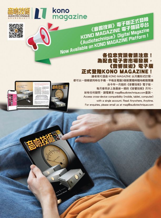 【音響技術】書刊在全港書報攤、音響店、CD店鋪有售。《音響技術》電子版現已在電子雜誌平台KONO MAGAZINE上架,讀者可在該平台以月費形式訂閱,便可以一個帳號同時在手機、平板及電腦3個裝置輕鬆閱讀《音響技術》電子版。