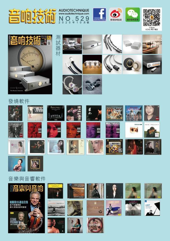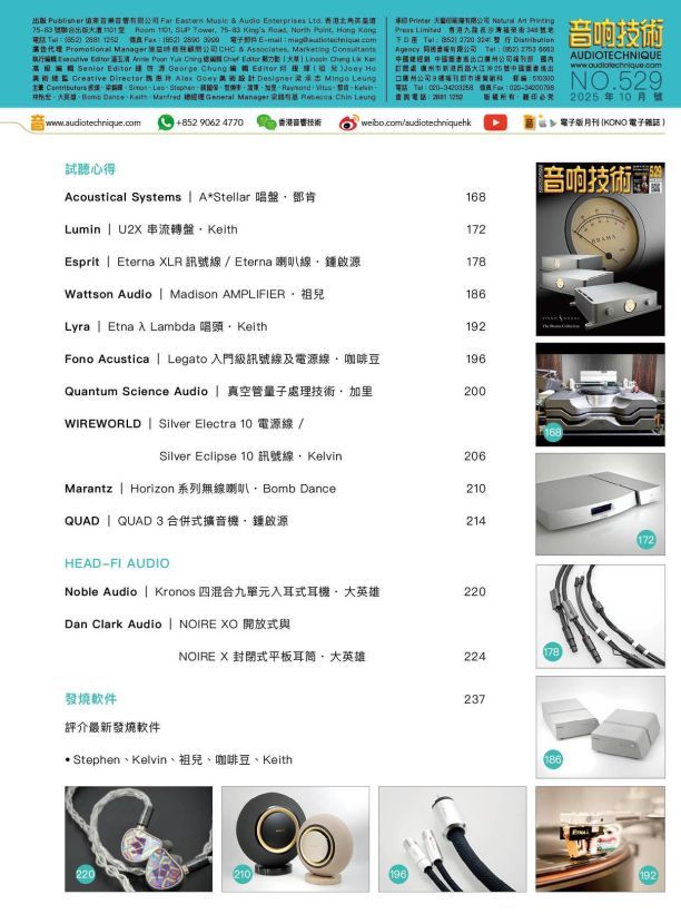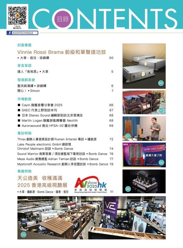 今期封面專題由大草、祖兒、梁錦暉評論 Vinnie Rossi Brama前級和單聲道功放。專題特稿 :天公造美 收穫滿滿 2025香港高級視聽展。專訪特稿:Thrax創辦人兼首席設計師Rumen Artarski專訪、Lake People electronic GmbH總經理Christof Mallmann訪談 、Sound Warrior商業發展/項目總監城下隆榮訪談、Meze Audio銷售總監Adrian Temian訪談、Mysticraft Acoustic Research創辦人李冠霆訪談。其他評論文章包括:Acoustical Systems A*Stellar 唱盤、Lumin U2X 串流轉盤、Esprit Eterna XLR訊號線/ Eterna喇叭線、Wattson Audio Madison AMPLIFIER、Lyra Etna λ Lambda 唱頭、Fono Acustica Legato入門級訊號線及電源線、Quantum Science Audio 真空管量子處理技術、WIREWORLD Silver Electra 10 電源線 / Silver Eclipse 10 訊號線、Marantz Horizon系列無線喇叭、QUAD QUAD 3合併式擴音機、Noble Audio Kronos四混合九單元入耳式耳機、Dan Clark Audio NOIRE XO 開放式與 NOIRE X 封閉式平板耳筒。詳細內容請參閱目錄。