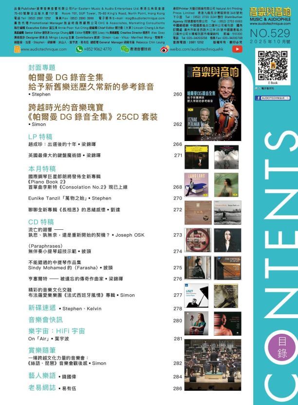 今期的音樂與音响封面專題 : 帕爾曼DG錄音全集給予新舊樂迷歷久常新的參考錄音。LP特稿 : 趙成珍:出道後的十年、英國最偉大的鍵盤魔術師。本月特稿 : 國際鋼琴巨星郎朗將發佈全新專輯《Piano Book 2》首單曲李斯特《Consolation No.2》現已上線、Eunike Tanzil「萬物之始」、劉達聊聊全新專輯《長相思》的思緒感懷 。CD特稿 :流亡的廻響 —— 孰悲、孰無奈,還是重新開始的契機?、〈Paraphrases〉無伴奏小提琴超技示範、不能錯過的中提琴作品集Sindy Mohamed的〈Farasha〉 、亨塞爾特 —— 被遺忘的傳奇作曲家、精彩的音樂文化交融 布法羅愛樂樂團《法式西班牙風情》專輯。其餘的新碟速遞、賞樂隨筆、藝人樂語、HiFi宇宙、老易網誌 …等等欄目也是同樣內容豐富,記緊捧場啊!