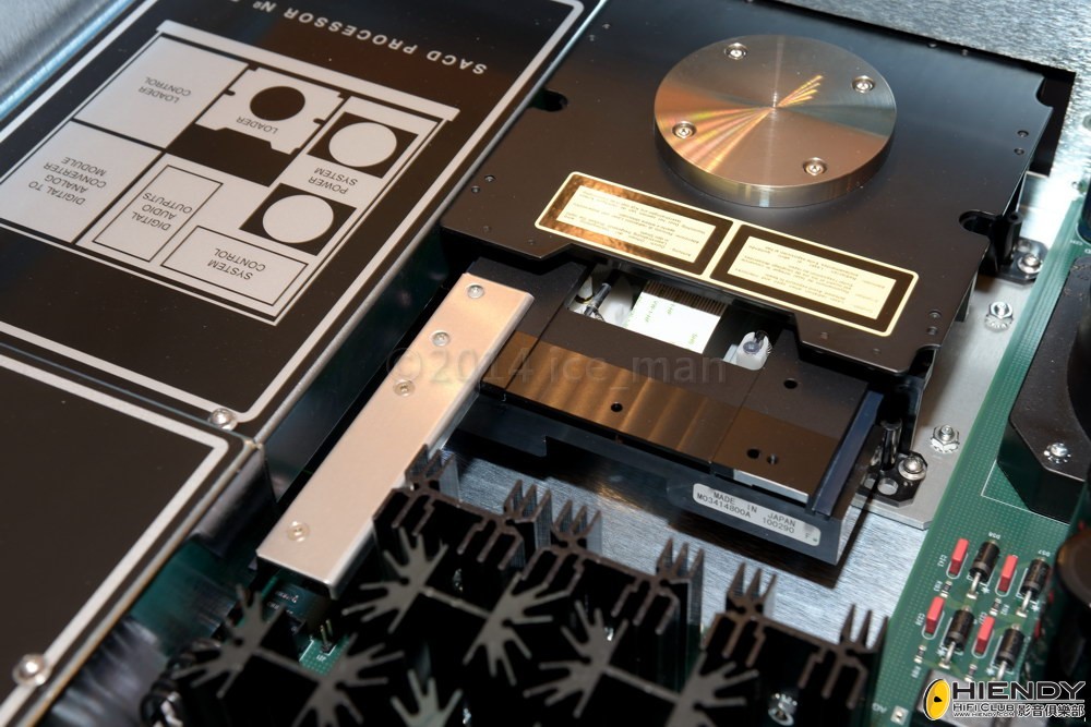 至於內涵方面作為Mark Levinson的第一款SACD的產品,每一方面都相當重視,首先整個轉盤架構包括轉盤與機芯部份及控制電路均採用了Esoteric的 VOSP(Vertically aligned Optical Stability Platform)系統,但這個系統成本相當高昂,不過VSOP能保證鐳射頭能以最垂直的角度讀取光碟上的訊號,使雷射光頭在閱讀光碟的訊號時誤差降到最 低,其品質為業界一致公認。廠方為了進一步降低唱片於高速運轉時的所產生的震動,廠方把整個轉盤鎖於一塊厚厚的鋼板上再固定於機箱的底板,先前提及過 No.512的機箱用料亦相當有份量,能提升整體光學讀取的穩定度。至於控制電路方面亦以1.5mm厚的鋼板覆蓋作為屏蔽之用,進一步減低外界的電磁與射 頻干擾。