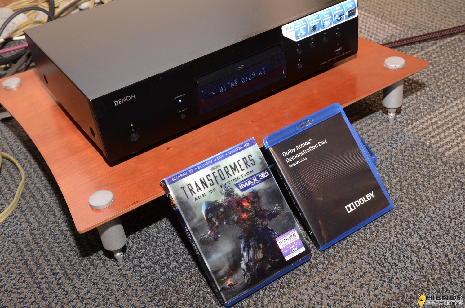 趁示範會還未開始,我趕快試播Dolby Atmos Demo Disc…..幾段落葉、落雨、行雷和一級方程式片段作小試牛刀,雖然只是中價擴音機,但完全能表現到Atmos的優勢,Object果然圍繞著你而 走,因示範會刻意將後置的CM6 S2放在腳架上而沒有掛於牆壁上方,所以影片中花瓣移動時上方之定位分外突出。再看看手錶,仍有時間,二話不說便將變型金剛[殲滅世紀]光碟換入藍光機 內,爆了其中一段已經感受到那四隻天花喇叭的威力,音場既高且闊, 果然有料到!!!