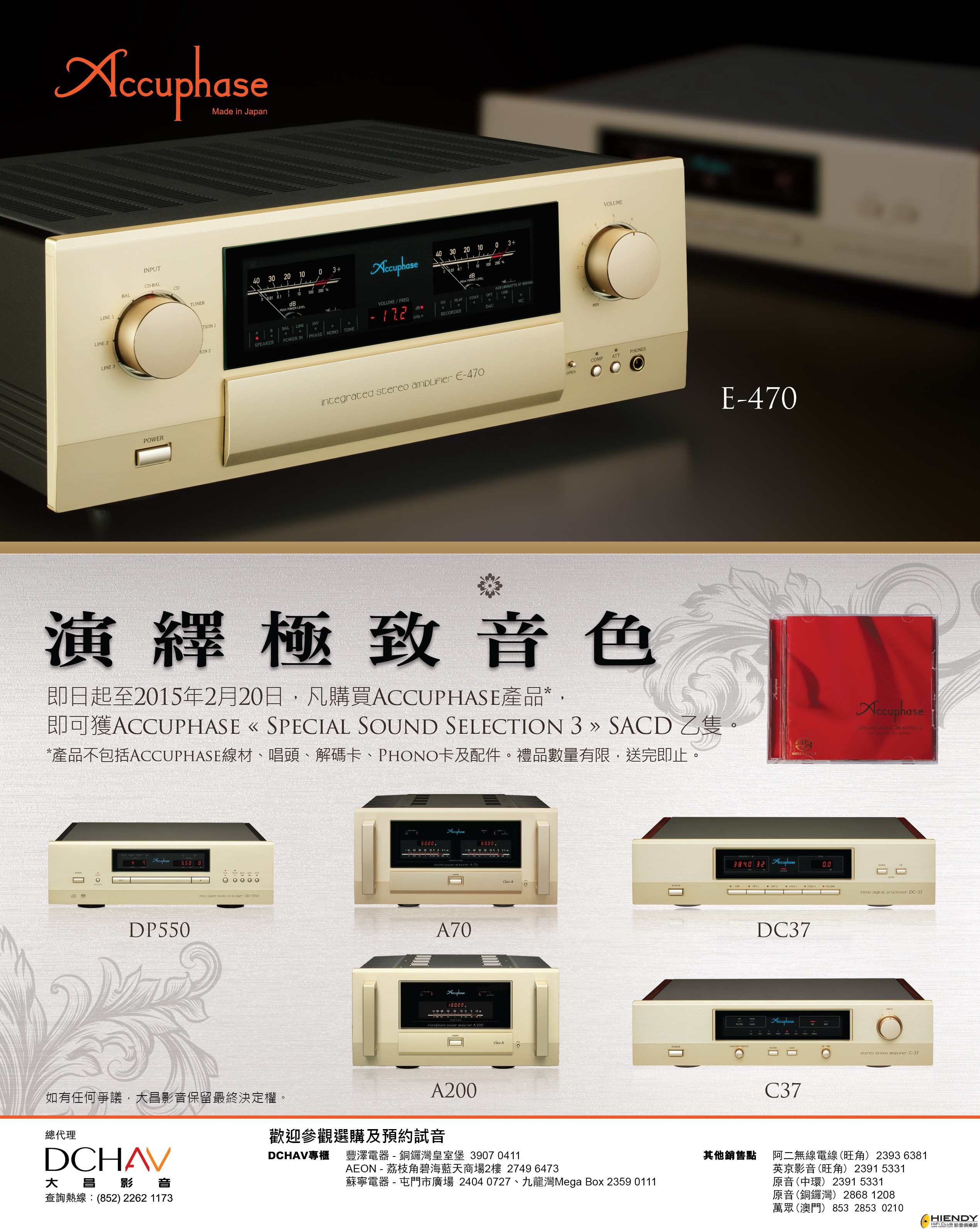 即日起至2015年2月20日,凡購買Accuphase產品*,即可獲 Accuphase <Special Sound Selection 3> SACD 乙隻。 禮品數量有限,送完即止。