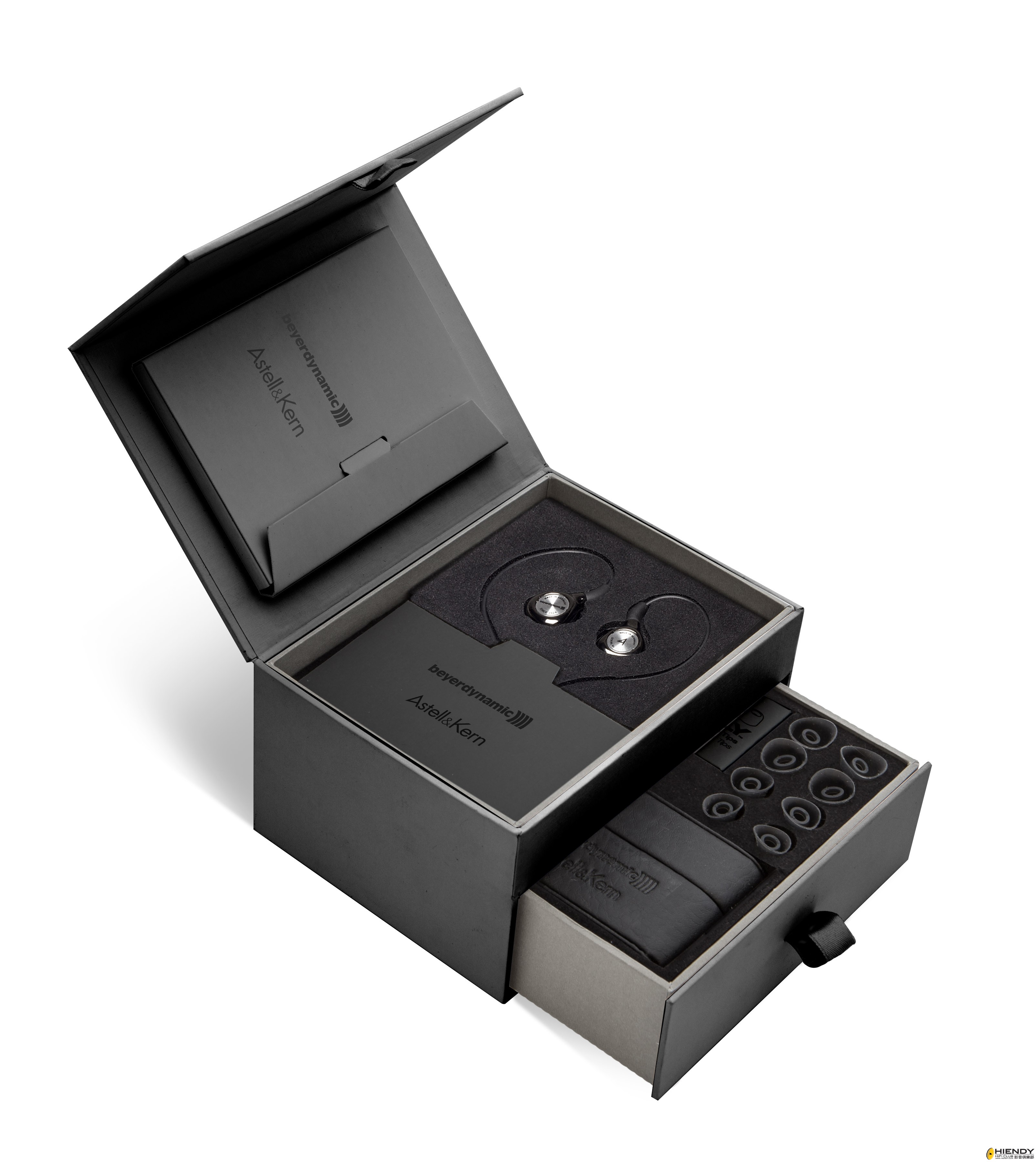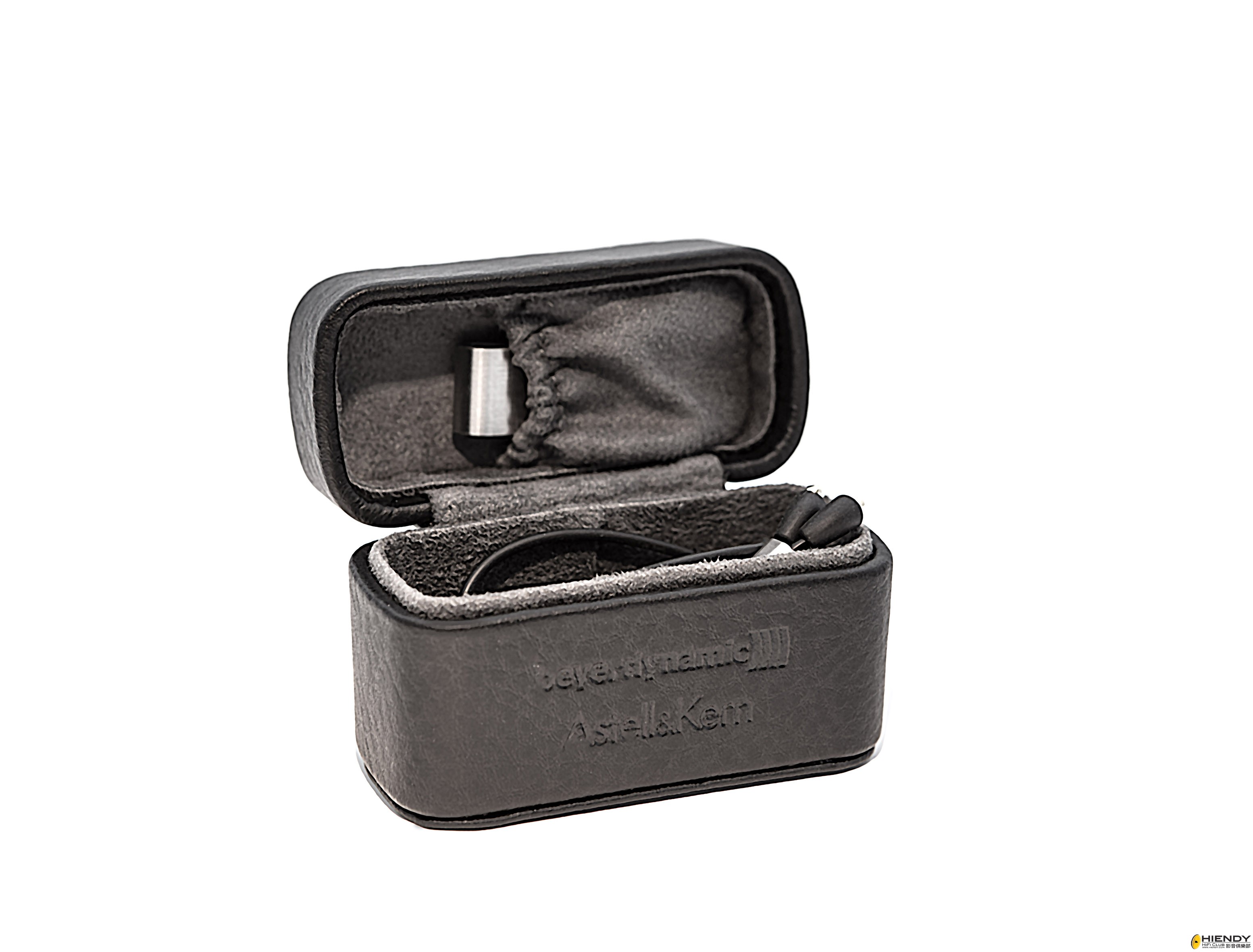 AK T8iE的便攜盒十分雅緻,盒外壓印了Beyerdynamic和Astell&Kern兩個品牌的標誌,盒內除了有足夠空間放置耳機,頂部也有 小格存放備用的耳膠/耳棉。為了減低使用時線材繞到其他物件的機會,盒內亦附有一個印有Beyerdynamic標誌的線夾,十分貼心。