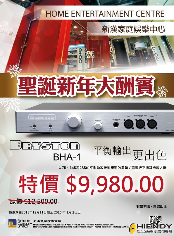Bryston BHA-1 平衡耳筒擴音機,由明天開始在新漢灣仔陳列室以特價發售, 至明年1月2日截止