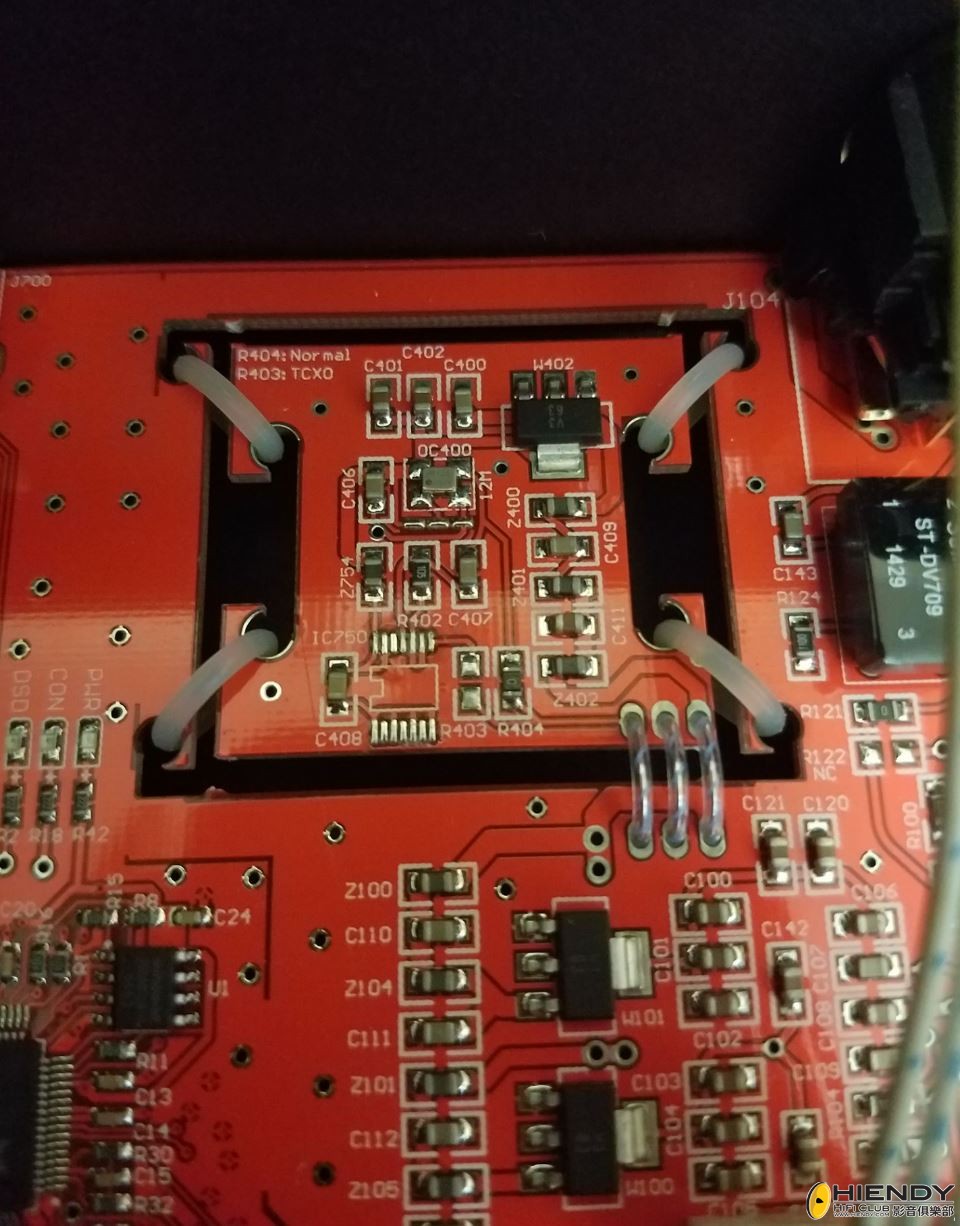 圖中可以看到一塊懸掛的PCB板,這就是時鐘源,上面搭載了WM8805使用的12M晶振,這個晶振為日本KDS產品,低相噪低抖動,抖動達到了1.5ps RMS的水準。 的晶振需要有設計完善的周邊電路,給予晶振設計一套完善的電源,再把它懸掛安裝,完全杜絕高頻振動,有利於晶振性能的發揮。