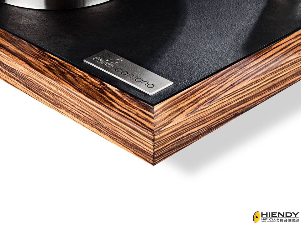 至於底座部份,Cantano刻意用上一整片(頁岩),目的是加強唱盤的剛性,和巧妙地採取不同物料的諧震點作隔離兩項基本制震元素,石板外圍的木框只是裝飾而已,所以廠方設有4款不同的木色可供客戶選擇。石底板下設有三隻不鏽鋼鑄造的釘腳承托整座唱盤,而且可調高低以作唱盤水平校正之用。另外還配備德國專造音響配件廠家SSC的底碟,令整個制震設置更加完美。